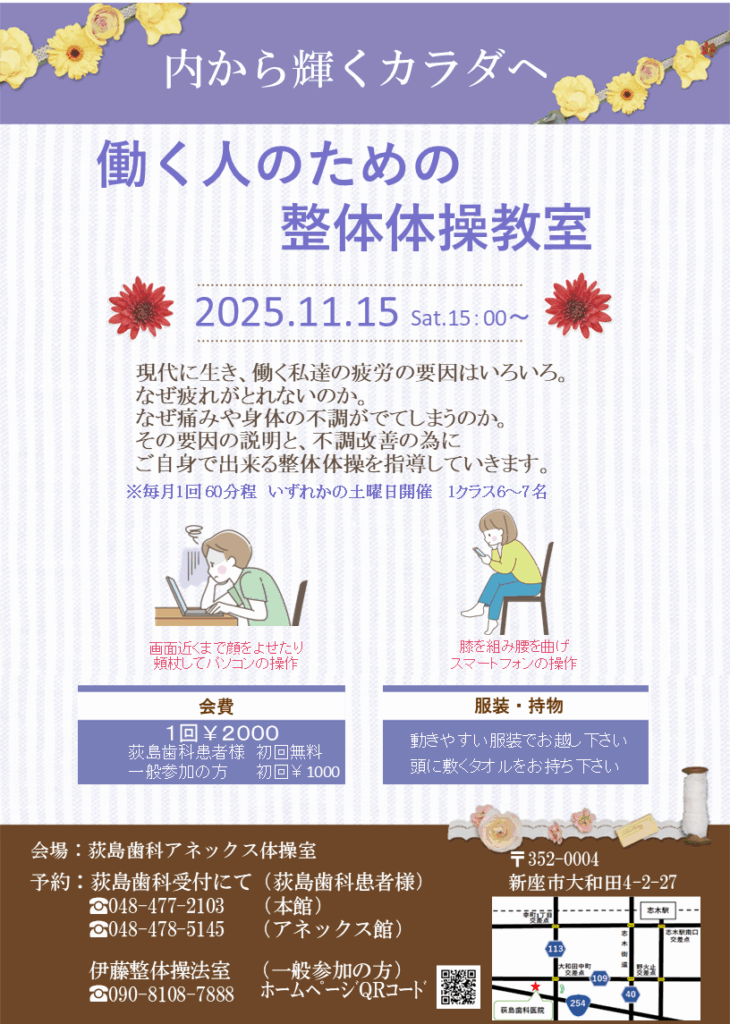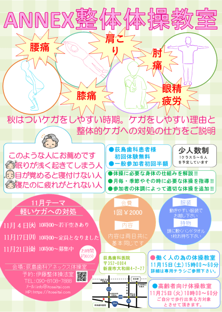体操教室11月のお知らせ2025.10.27新座市にございます荻島歯科アネックス館にて整体体操教室を行います。皆様のご参加をお待ちしています。 伊藤寿規InstagramContact 石神井公園体操会11月のお知らせ前の記事 石神井公園体操会12月のお知らせ次の記事