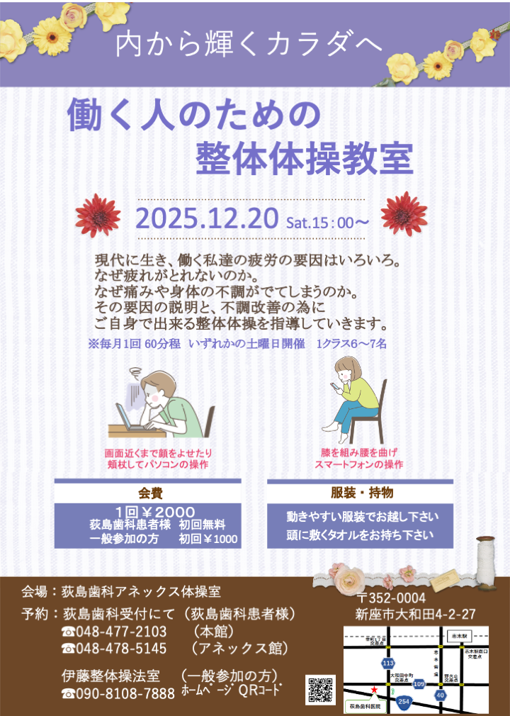 体操教室12月のお知らせ2025.11.22新座市にございます荻島歯科アネックス館にて整体体操教室を行います。皆様のご参加をお待ちしています。 伊藤寿規InstagramContact 石神井公園体操会12月のお知らせ前の記事 石神井公園体操会2026年1月のお知らせ次の記事