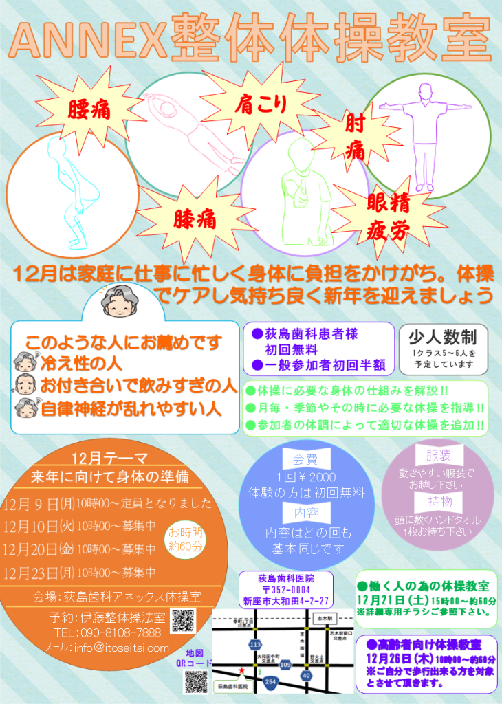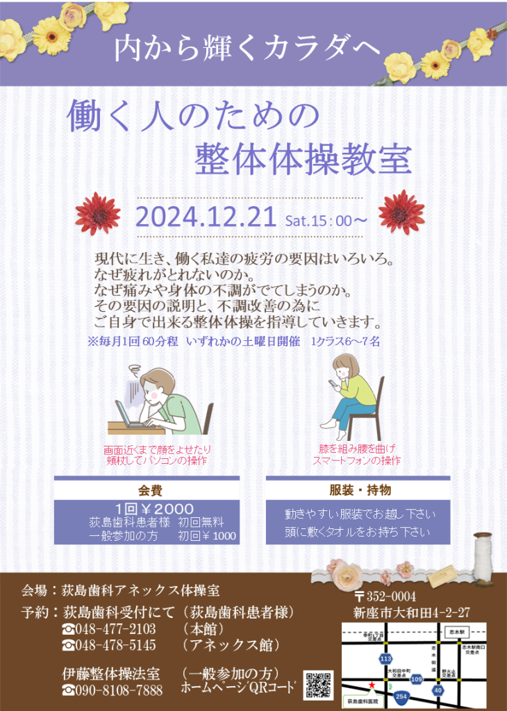 体操教室2024年12月のお知らせ2024.11.29新座市にございます荻島歯科医院アネックス館にて整体体操教室を行います。皆様のご参加お待ちしております。 伊藤寿規InstagramContact ホームページを新しくしました。前の記事 石神井公園体操会 2024年12月のお知らせ次の記事