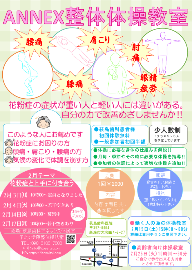 体操教室2025年2月のお知らせ2025.01.31新座市にございます荻島歯科アネックス館にて整体体操教室を行います。皆様のご参加をお待ちしています。 伊藤寿規InstagramContact 石神井公園体操会 2025年2月のお知らせ前の記事 石神井公園体操会2025年3月のお知らせ次の記事