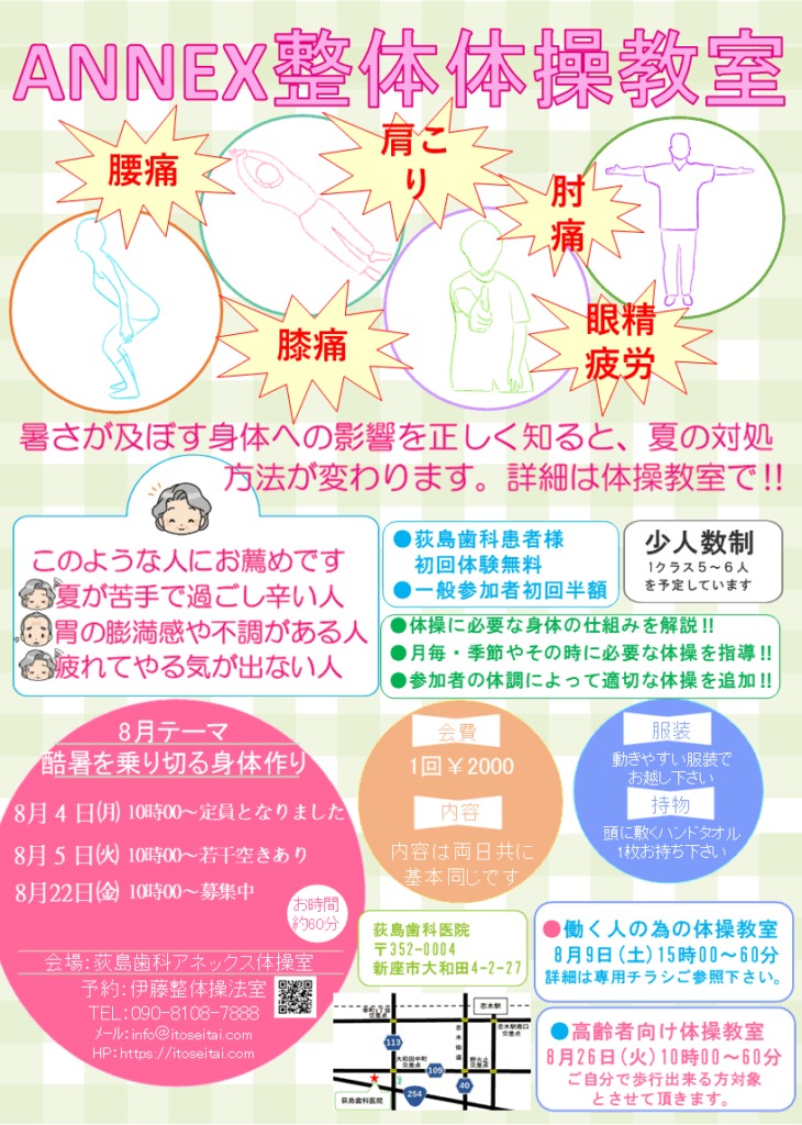 新座市にございます荻島歯科アネックス館にて整体体操教室を行います。