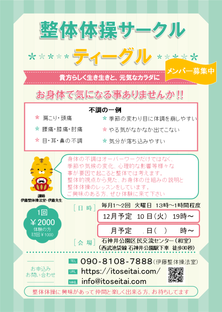 石神井公園体操会 2024年12月のお知らせ2024.11.29西武池袋線 石神井公園駅下車 徒歩30秒の場所にあります、石神井公園区民交流センターの一室をお借りして体操教室を行なっております。働く女性・男性、子育てを頑張るママ・パパ自分の身体をケアして、健康に毎日を過ごしたい方、整体の考え方や整体体操がきっとお役に立つと思います。ご興味のある方、ぜひご連絡ください。 伊藤寿規InstagramContact 体操教室2024年12月のお知らせ前の記事 石神井公園体操会 2025年1月のお知らせ次の記事