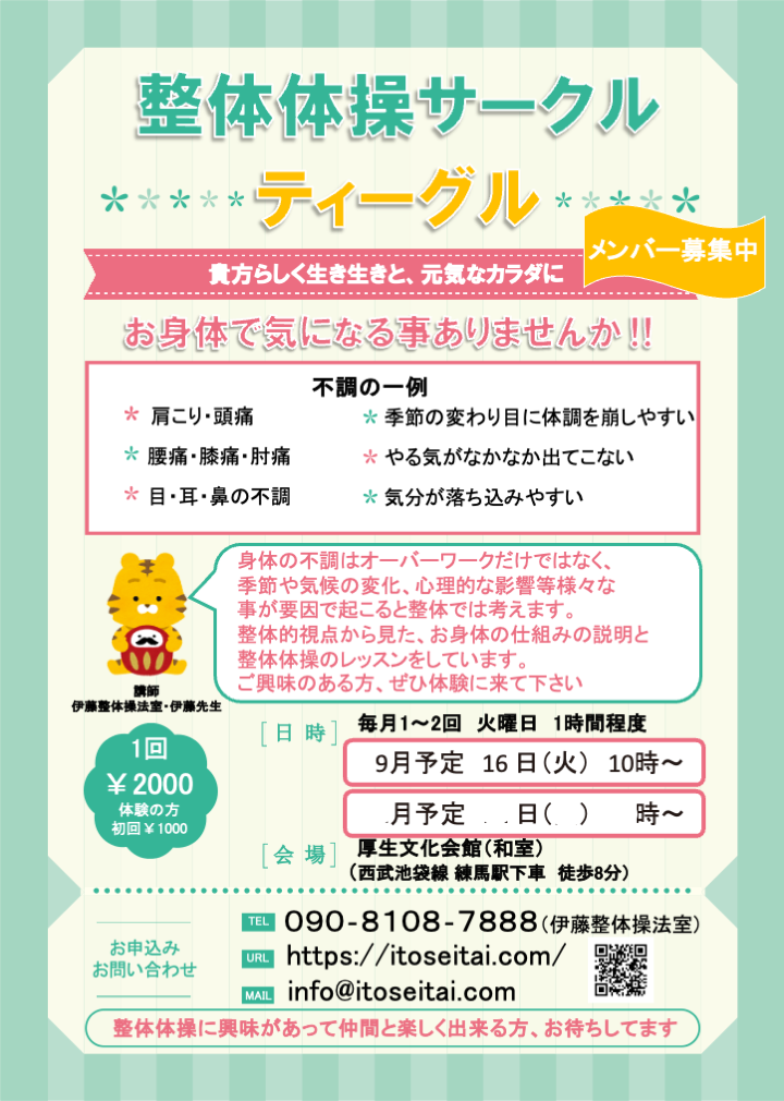 石神井公園体操会2025年9月のお知らせ2025.08.30いつもでしたら西武池袋線 石神井公園駅下車 徒歩30秒の場所にあります、石神井公園区民交流センターの一室をお借りして体操教室を行っておりますが、センターの改修工事の為に場所を変更し、9月は西武池袋線練馬駅徒歩8分厚生文化会館にて体操教室を行います。働く女性・男性、子育てを頑張るママ・パパ 自分の身体をケアして健康に毎日を過ごしたい方、整体の考え方や整体体操がきっとお役に立つと思います。ご興味のある方、ぜひご連絡下さい。 伊藤寿規InstagramContact 体操教室8月のお知らせ前の記事 体操教室9月のお知らせ次の記事